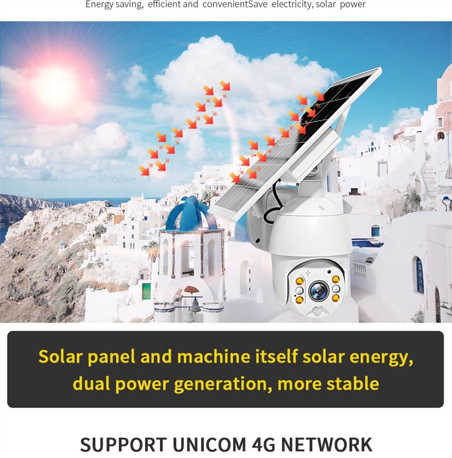 4. Pan Mejjel Wiesgħa View & Kontroll mill-bogħod---kamera solari ptz tipprovdi angoli tal-vista ta' rotazzjoni ta' 360 grad orizzontali u 120 grad vertikali. Jappoġġa l-kontroll mill-bogħod tad-direzzjoni fuq it-telefon tiegħek. B'karatteristiċi ta 'zoom diġitali 3x, u qsim multi-utenti, li jipprovdi veduta aktar flessibbli u usa' għalik u għall-familji biex tissorvelja d-dar tiegħek f'viżjoni kollha f'ħin reali. L-għażla tal-kamera solari ta 'barra tipproteġi d-dar tiegħek 24/7.